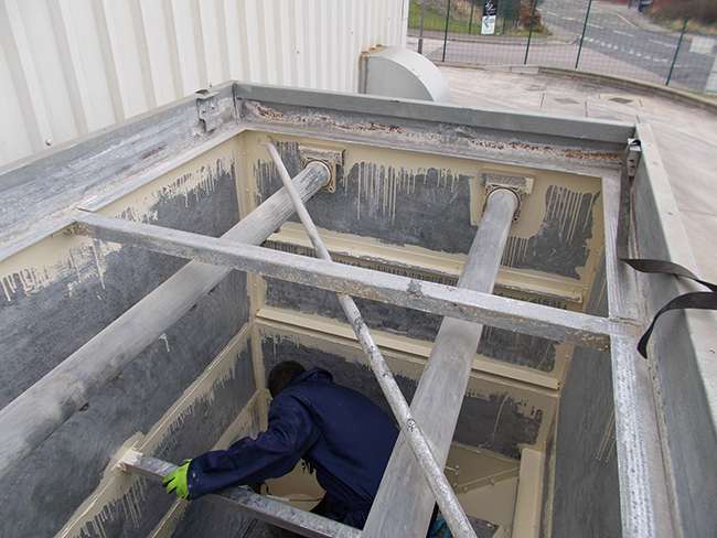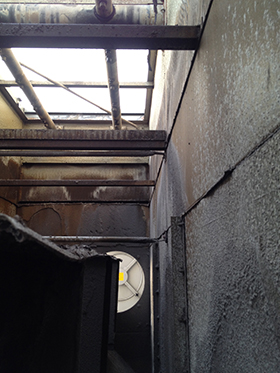 The internal surfaces of a cooling tower over time will start to deteriorate due to general operational use, or in this particular example below the internal surfaces could be damaged due to excessive volumes of chemical dosing by a previous poor quality Water Treatment Service Provider.
