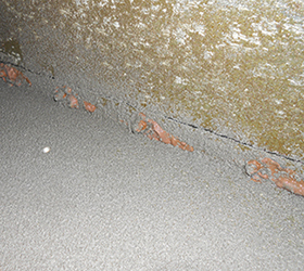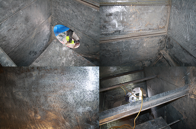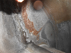 The high level of solids within the Cooling Tower water had started to abrade certain areas of the internal surfaces and in places fully remove the existing coating back to the steel surface itself as clearly identified above and has resulted in corrosion and surface damage
