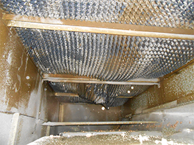 This picture above identifies the Cooling Tower packing which has started to collapse. Cooling Tower packing is a vital part of the control of water droplets entering the atmosphere outside the cooling tower.