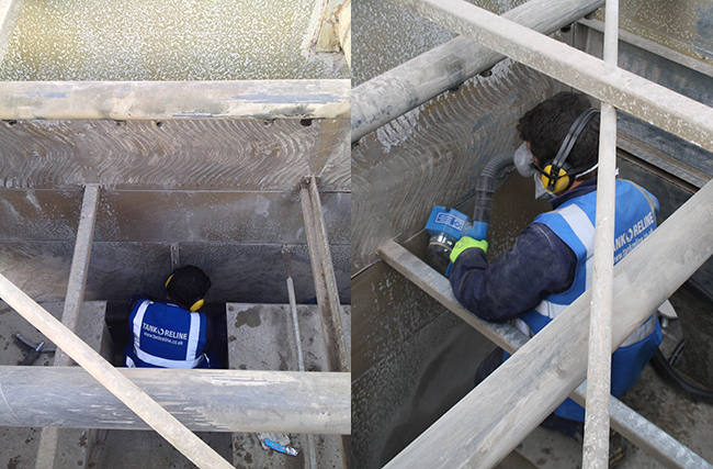 The above identifies a Tank Reline engineer carrying out preparation works with our specialist mechanical power tools.